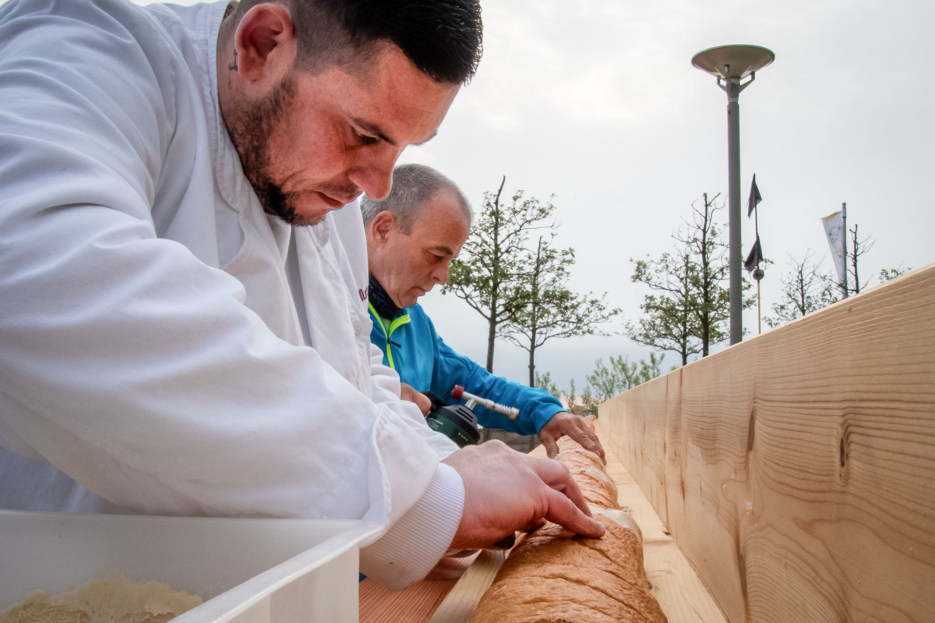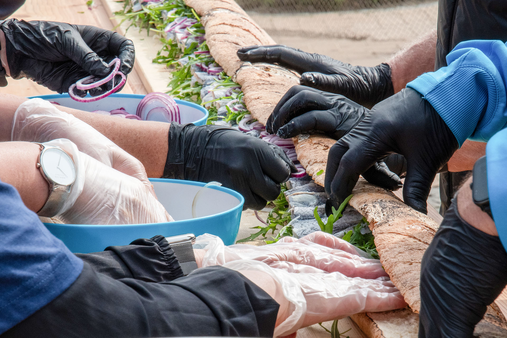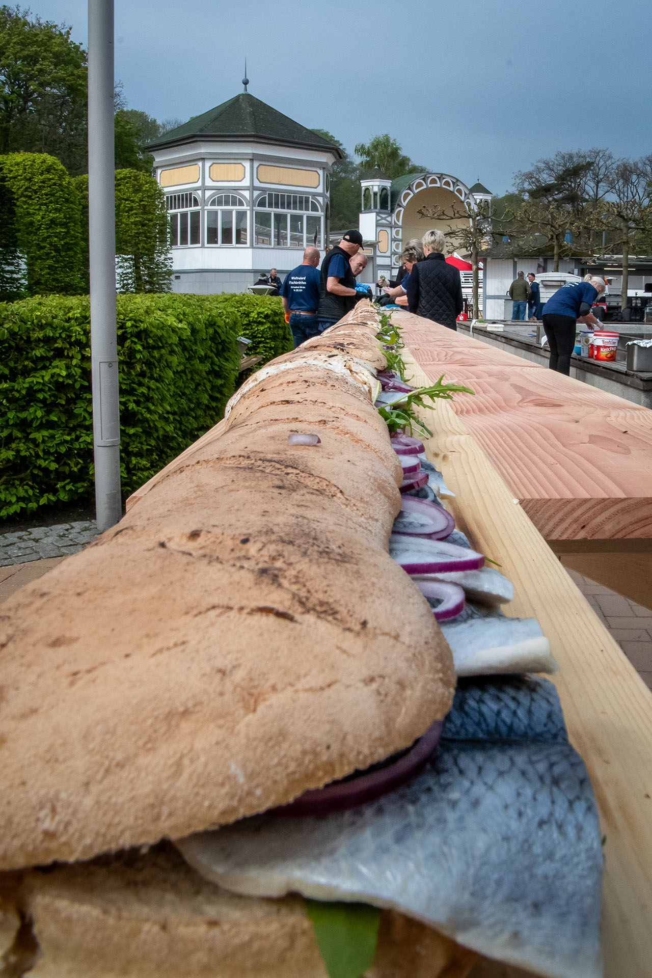 Die Zimmerei Nagel fertigte eigens dafür einen über 30 m langen Tisch an. Ein regionaler Bäcker hat fast 24 Stunden lang Baguettes nach Spezialrezept gebacken, die dann vor Ort ab 5.00 Uhr morgens zusammengebacken wurden, so dass dann letztendlich ein Brötchen mit einer Länge von 30,95 m entstand. Dieses wurde von vielen fleißigen Helfern mit einigen Kilo Salat, 60 kg selbst eingelegten Bismarck-Hering und 20 Kilo roten Zwiebeln belegt. Pünktlich 12.00 Uhr war das Brötchen dann zur Abnahme bereit und der Weltrekord geschafft.